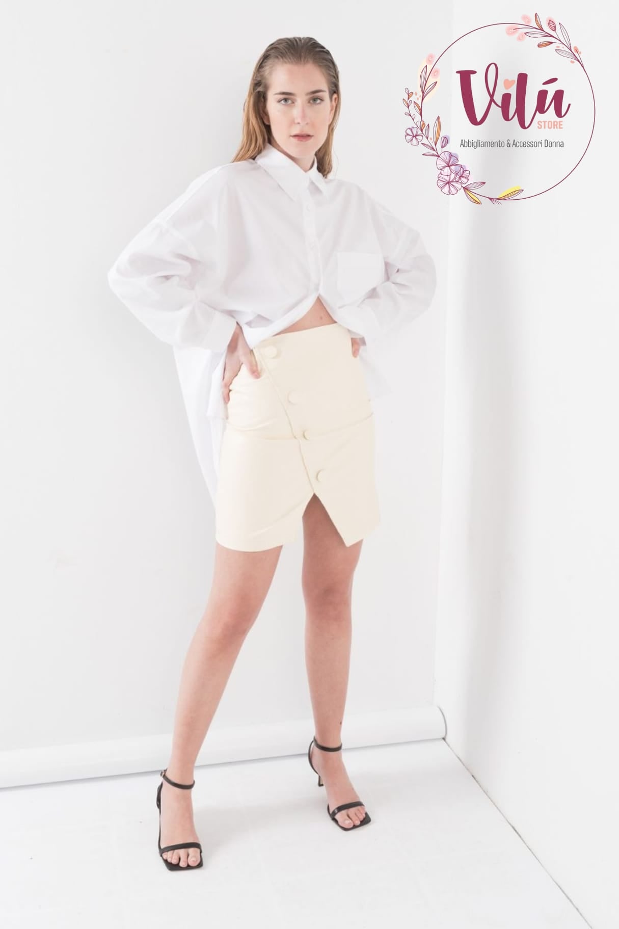 Gonna ecopelle con effetto bottoni trasversali e mini spacco
